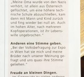 Erinnerst du dich noch an meine Weihnachtsgeschichte? Meine Oma liegt unterm Christbaum! Dort habe ich geschrieben, dass meine Oma nie in der Zeitung gestanden ist und wohl auch nie in der Zeitung stehen wird. Ich habe mich geirrt! 🙂 🙂 🙂 Laya Commenda hat im Magazin „Welt der Frau“ über Großeltern geschrieben, mich über meine Oma interviewt und das in der April-Ausgabe veröffentlicht! So ist meine Oma mit ihren mehr als 95 Jahren […]