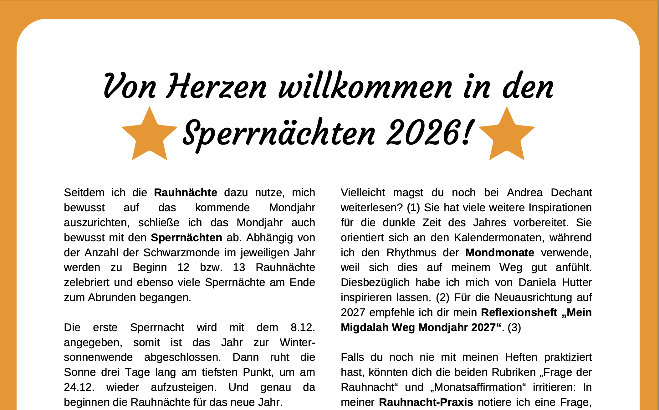 Dieses Reflexionsheft unterstützt dich auf deinem bewussten Migdalah-Weg. Es dient deiner persönlichen Praxis in den Sperrnächten 2026 und bietet dir einen Rahmen für den bewussten Abschluss dieses Mondjahres. Es beinhaltet eine ausführliche Anwendungsempfehlung und lässt dir gleichzeitig viel Spielraum für deine individuelle Art der Selbstreflexion.